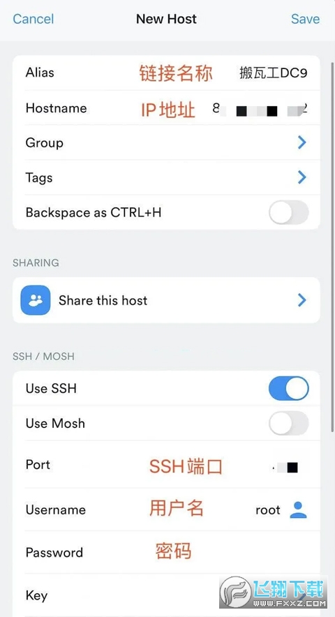 2、这个页面需要输入连接名称和连接信息,这里以搬瓦工VPS为例,填入连接名称(随便填)、VPS的IP地址、SSH端口、用户名(一般是root)和root密码,模式选择“SSH”,之后点击“Save”保存设置: